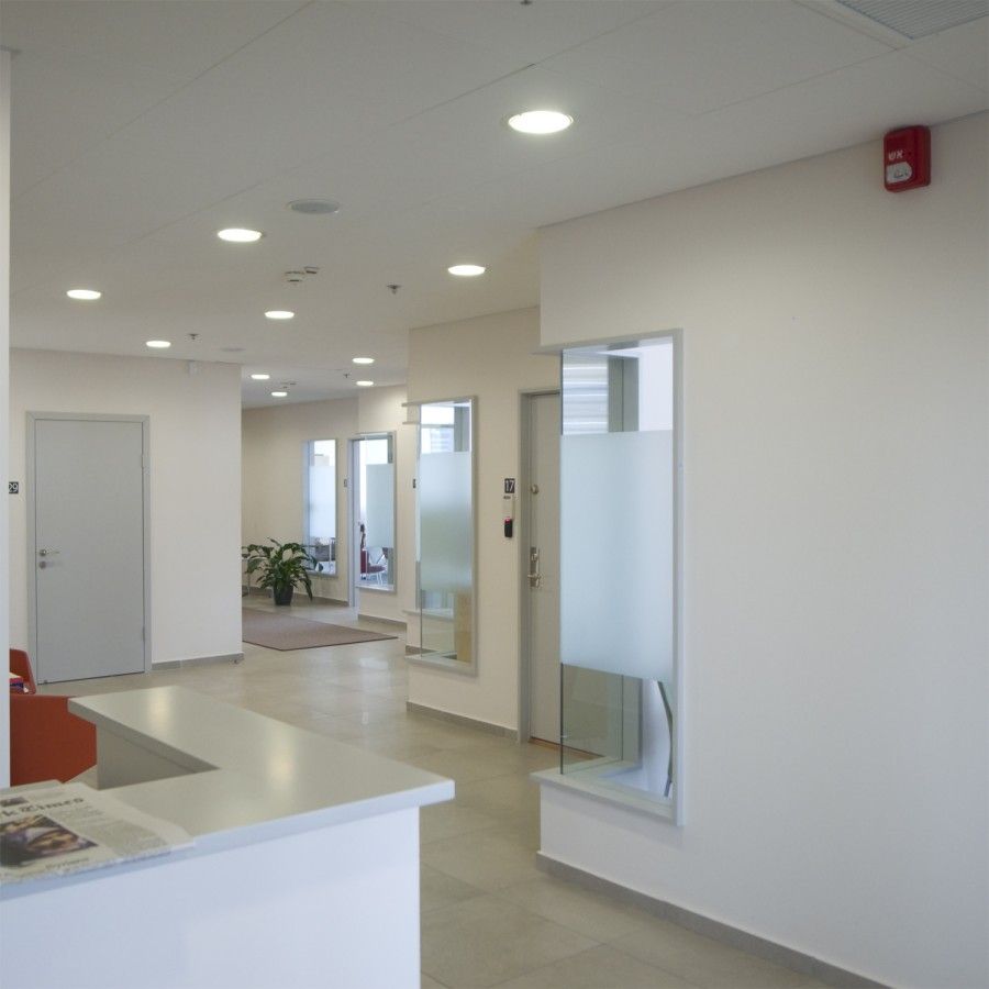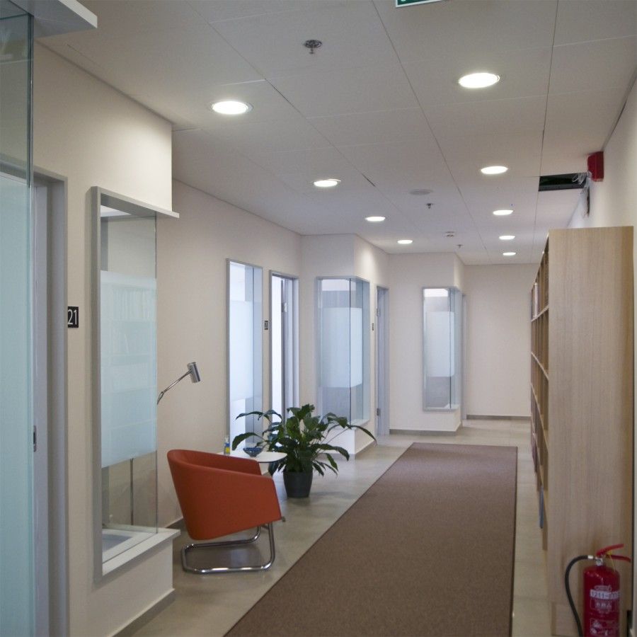 Då byggnadens planform är rund och kontoren delades in med radiella väggar blev korridoren mellan kontorsrummen och kärnan en utmaning. Lösningen blev att trappa bredden och låta korridoren vidga sig till en större bredd i mitten. Kontorsrummens hörn öppnades för med glaspartier över hörn, vilka sticker ut som lyktor mot korridoren och kärnan.
