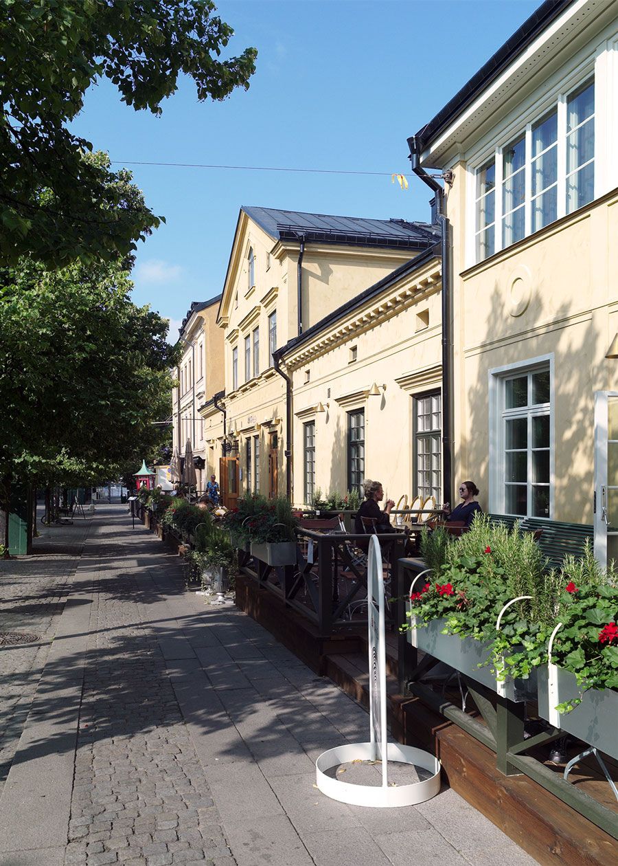 Uteserveringen mot Djurgårdsvägen inramas av ett trästaket utformat efter 1928 års förlaga. Åt Allmänna gränd har uteserveringens stålstaket från sent 1980-tal ersatts med ett lätt trästaket med kryssmotiv.
