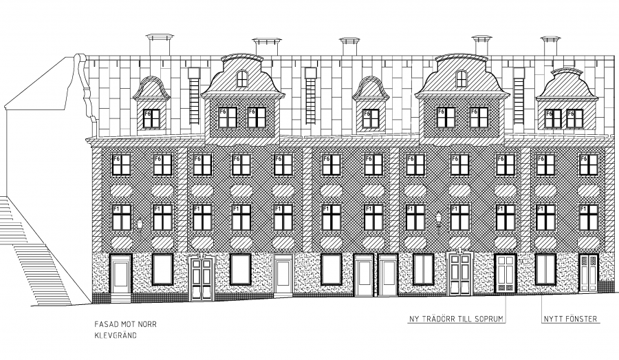 FASADRENOVERINGEN Den föregående fasadrenoveringen utfördes 1959. Fasaderna mot Klevgränd och Katarina kyrkobacke putsades då med en röd spritputs. Putsbruket var ett kalkcementbruk och genomfärgat med järnoxid (typ Falu rödfärg). Pigmentmängden var mycket stor för att erhålla den djupröda kulören. Detta bidrog till att bruket blev svagt. Efter drygt femtio år var fasadputsen uttjänt. Delar hade eroderat bort, större ytor var förgipsade och det röda pigmentet hade runnit ned på fönsteromfattningar och sockel. Putsbruket på sockelvåningen mot Klevgränd är var med kalkputs och har klarat sig mycket bättre än fasadputsen. Inför den nu genomförda renoveringen togs beslutet att befintlig puts skulle knackas ned och att fasaderna skulle putsas om med en äkta kalkputs och därefter avfärgas med järnvitriol. Putsarbetet utfördes av Tremans Fasad AB från Hedemora.