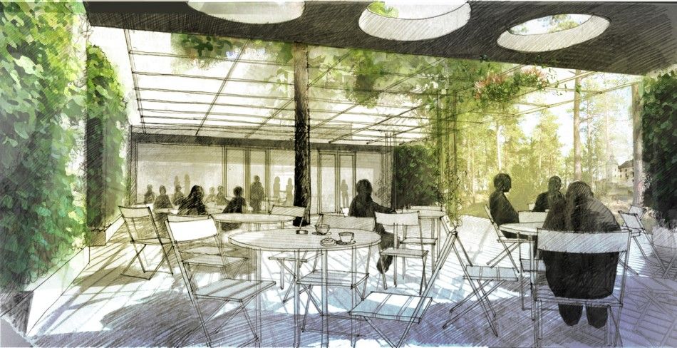 Restaurangen är helt glasad mot gården och mot öster. Den östra sidans glas kommer att ge en utblick mot häcken vilket gör hela denna vägg till en grön vägg. Vid bardisken bildar väggen ett burspråk med utblick mot vattnet. Längs den västra väggen finns lanterniner som ger överljus. Restaurangen rymmer det efterfrågade antalet platser. Köket är placerat i byggnadens sydligaste del för att kunna nås med transporter via en egen väg för att inte promenerande besökare skall störas, samt att det ger möjlighet till kökstransporter under hela dagen. Kylt soprum finns i anslutning till lastbryggan mot den lastgård som bildas mellan häckens förlängning och berget i öster. På lastgården finns plats för sorteringskärl för torra sopor.UTSTÄLLNINGSRUMMET