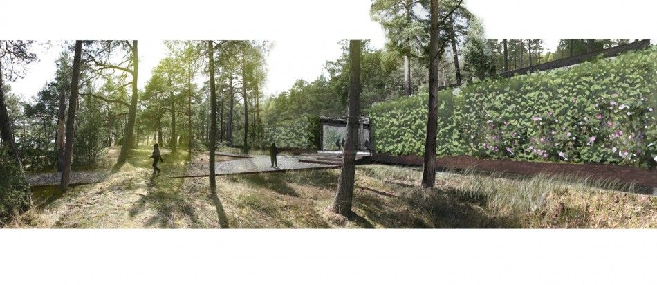 Anna gömmer sig bakom en häck av avenbok med inslag av rosor. Häckarna är formklippta och bildar husets synliga fasad. De växer i kar av kortenstål som konsolerar från grundläggningsplintarna, och med en distans till marken. Taken är med sedum dels för inneklimat och dels för att den som rör sig i skogen ovanför byggnaden, eller bor i stugorna, även fortsättningsvis skall se gräs och mossa i utblicken mot slottet.GÅRDEN