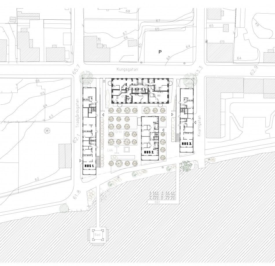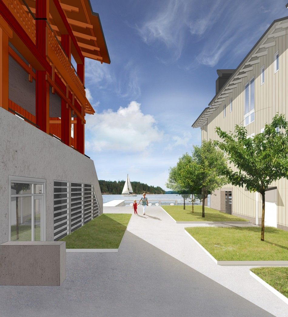 Vi har ritat ett hus på var sida om skolan, samt ett dem emellan. Husen vid sidan av skolan ligger i sidogatornas gatuliv. Tanken är att fortsätta på, och laga stadens struktur. Men de bägge yttre husen är tillbakadragna från Kungsgatan för att spara de stora träden samt ge lägenheterna i fd skolan bättre utsikt. Enligt stadens arkitektur borde husen gå ända upp till hörnen av tomten, men vi har gjort det avsteget. De yttre husen har röd slamfärgad panel som en inramning av kvarteret, huset i mitten är ljust med träpanel målad i en bruten vit kulör. Tillsammans ger de tre husen en bostadsyta på 1300m2.Husen är upplyfta på plintar eller pelare, och där på markplanet finns entréer och garage. Vi tycker inte att man behöver dölja det faktum att husen behöver lyftas upp; det påminner om en hamnbebyggelse med hus stående i eller nära vattnet med tåliga material där de är som mest utsatta. Mellan pelarna finns en glespanel som skyddar mot snödrev men låter luften svepa fritt. I det mittersta huset har detta utrymme i markplan istället fått ge plats för kanotupplag för kvarterets kommande roddarklubb.