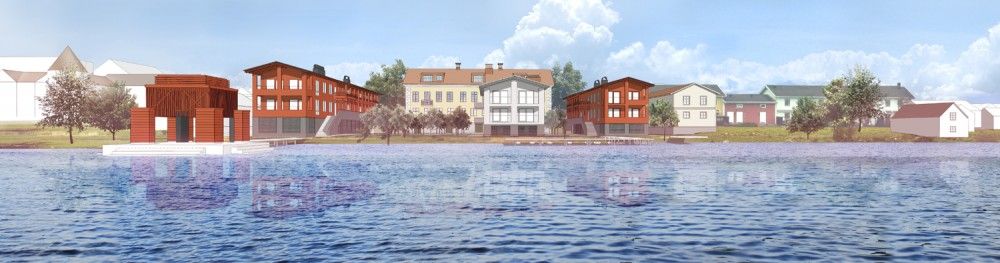 Vi provade först att göra breda hus på tomtens del ned mot vattnet. Det visade sig snart att det inte var möjligt att få dem att stämma med den struktur som den här delen av staden har i övrigt. Stora breda hus blir snabbt ett främmande inslag i denna rediga och strama stadsdel byggd efter timmerstockens längd. Vi valde därför att göra hus med samma bredd som de som redan finns på gatorna runt ikring. Det ger helt andra förutsättningar, men följer stadens struktur och tradition.