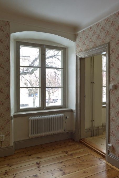 flagnande färg och snickerier generellt i behov av renovering och ommålning alternativt byte i sin helhet.Vid den första inventeringen noterades det att flertalet av de murade väggarna hade påbyggnadsväggar i form av läkt, träpanel och ytterst ett tapetserat skivmaterial. För att kvalitetssäkra den fortsatta projekteringen påbörjades en varsam rivning av ej skyddsvärda delar vilket gav en unik möjlighet för arkitekt och ansvarig antikvarie att inventera varje rum och byggnadsdel i minsta detalj inför upprättande av förfrågningsunderlaget. Dold under panel och skivmaterial återfanns delar av gamla tapetlager, profilerade putsade taklister och även golvsocklar. Detta gav oss en fingervisning om vilken årsring som skulle råda i renoveringen och på så sätt bidra till att berätta om husets historia. I praktiken så blev renoveringen i flera delar en restaurering av kulturhistoriskt värdefulla byggnadsdelar och detaljer som legat dolda i mer än ett halvt sekel. Där delar av äldre tapet återfanns pappspändes väggarna för att bevara skikten till framtida generationer. Nya tapeter valdes med de äldre som förebild.