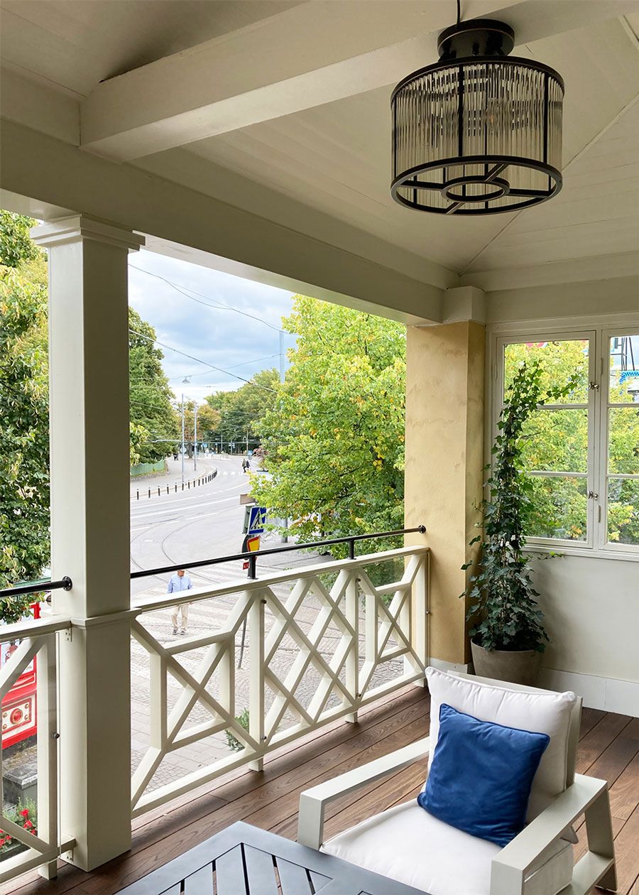 Uteserveringen mot Djurgårdsvägen inramas av ett trästaket utformat efter 1928 års förlaga. Åt Allmänna gränd har uteserveringens stålstaket från sent 1980-tal ersatts med ett lätt trästaket med kryssmotiv.