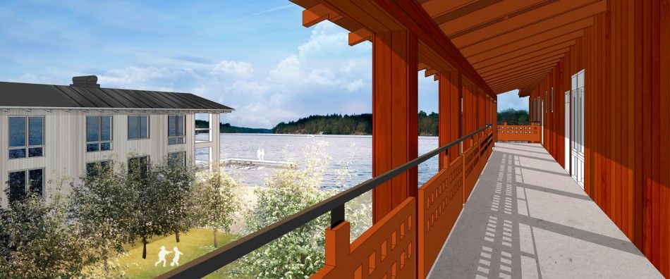 Vi har rest mycket i Bergslagen. Till Siggebohyttan har vi återvänt flera gånger. Byggnaden ligger som ett skepp i landskapet. Dess inbyggda svale, för kommunikationen i det övre planet, ger huset en oförglömlig karaktär. Vi har låtit oss inspireras av detta hus tillsammans med de hus vi sett inne i Lindesbergs stad. Svalen finns i form av en loftgång i de nya husen, men viktigare, den finns i planlösningen i lägenheterna genom den utsträckta hallen som har rikligt med fönster och binder samman rummen. Det har fått bli det motiv de flesta lägenheterna är byggda runt. Svalen (eller loftgången) ger rymliga balkonger för de lägenheter som ligger i husens ändar. Mittlägenheterna i det norra huset har balkong mot granntomtens gräs och parklandskap.De lägenheter som ligger ut mot vattnet har stora balkonger under tak. Viktigt här är att husets hörn är väl redovisade genom breda hörnpelare. Balkongerna blir därigenom en del av huset och inte något som hängts på huskropparna. Lägenheterna på första våningsplanet, i de bägge husen som ligger i tomtgräns, har uteplats på markplan under de stora träden mot Kungsgatan.